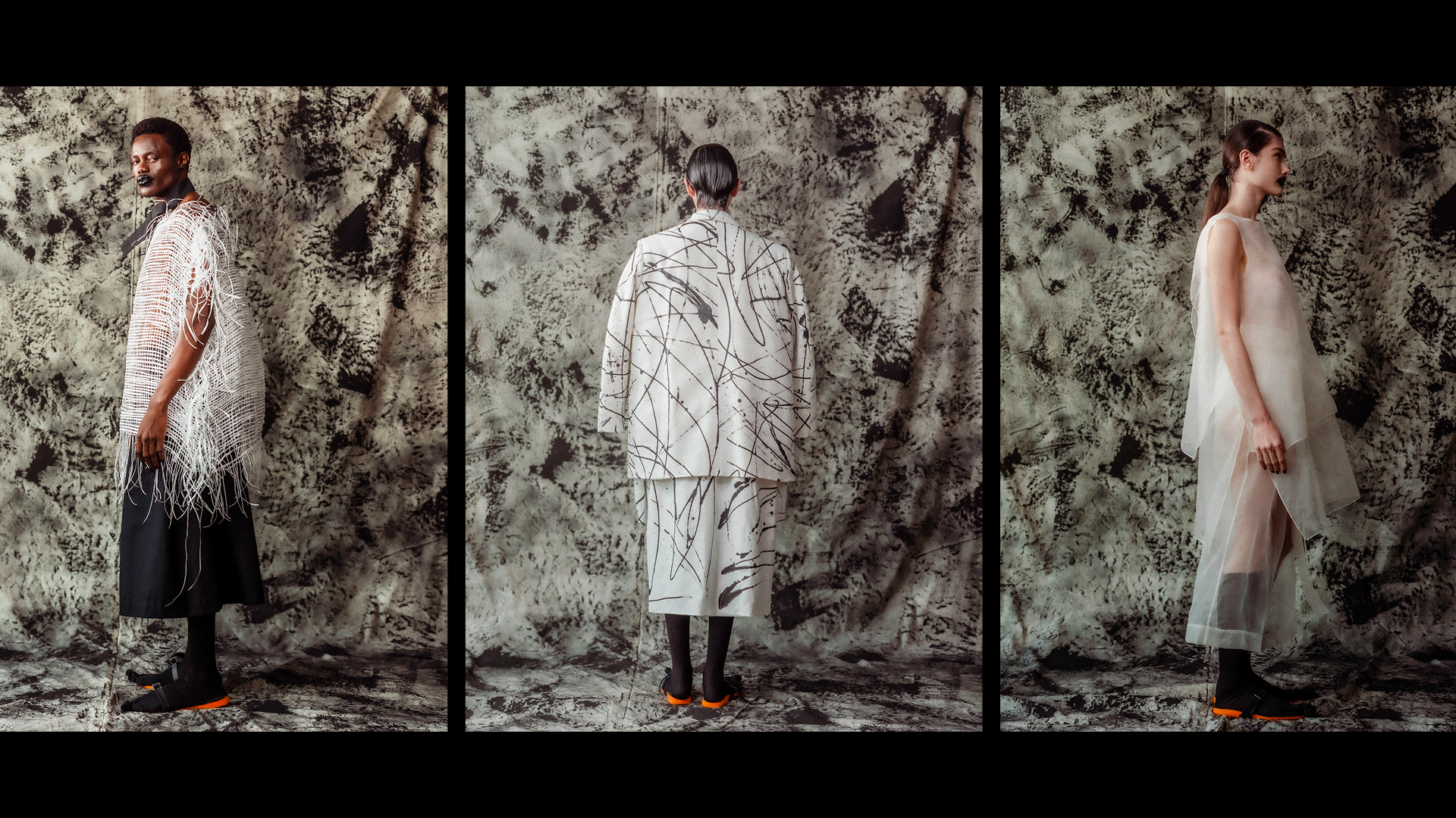 LC | Vice-versa, com certeza. Por exemplo, fiz ali no primeiro look uma ráfia de viscose de algodão, quase um tear, pensando justamente nessa superfície primordial dessa roupa de memória atávica. O material, sobretudo o resíduo, muitas vezes fala primeiro o que ele quer – antes de eu tentar impor uma forma. Então é sempre um diálogo entre matéria, linha e plano, entre os pontos e meu gesto enquanto criador, que está manipulando as materialidades.