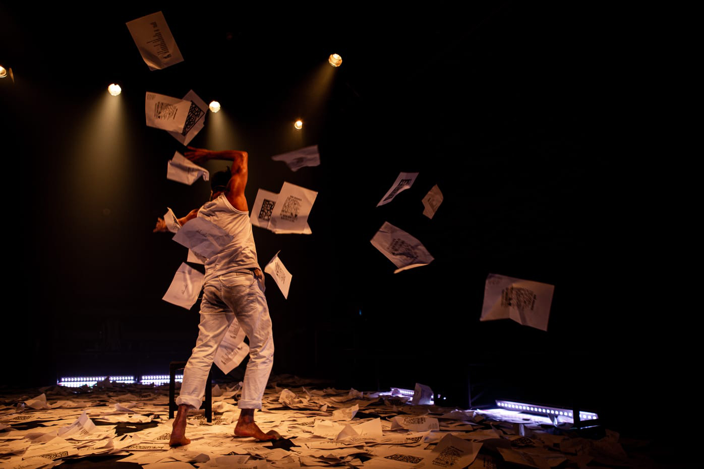 Um banco, sonoplastia, música, dança e um chão coberto com poesias do autor são os recursos que o ator usa para contar a história do poeta, jornalista, agitador cultural, compositor, cineasta, ator e um dos ideólogos da Tropicália.